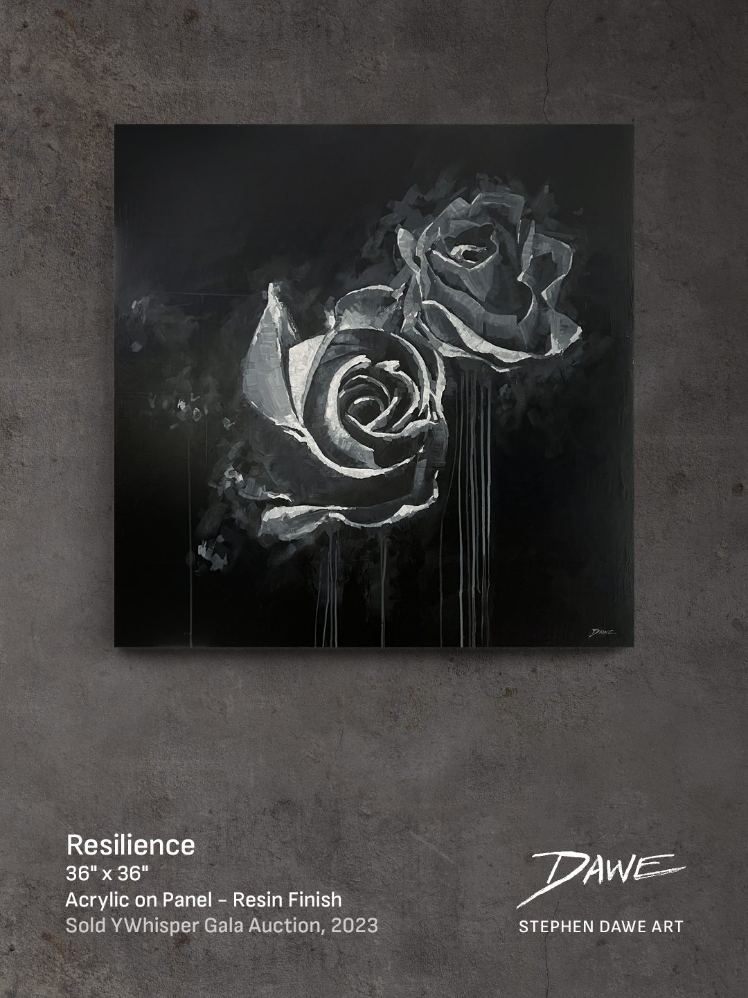 This piece was created for and auctioned at YW Calgary's annual YWhisper Gala. ‘In Her Words’ is inspired by the story of this year’s YWhipser Gala Guest Speaker, Pamela Anderson. From rock and roll to Hollywood, and from resilience to activist, this piece represents an awe-inspiring life told through the visual of roses in a garden she keeps close to her heart—continuing to rise up, break free, and find their way.